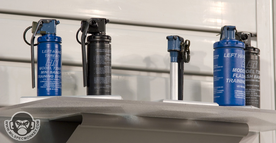 Gave these guys a media bugging right at the end of shotshow while they were packing up. I was foolish not to take pics of their 40mm launchers. As you can see they carry a vast range of less lethal products and their training counterparts. One thing I had not seen before was the mini-bang. They have the same qualities as a full flashbang, however smaller and 30% lighter. Fits in 40mm shell loops and some double mag pouches.