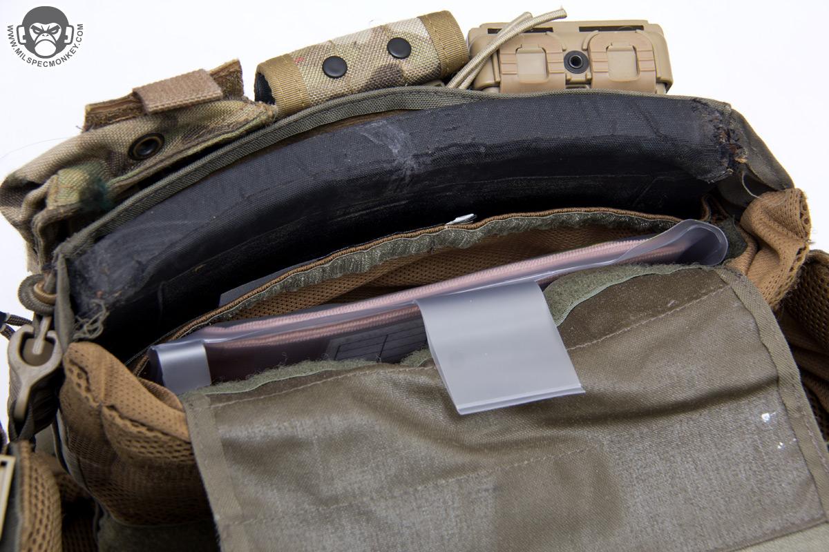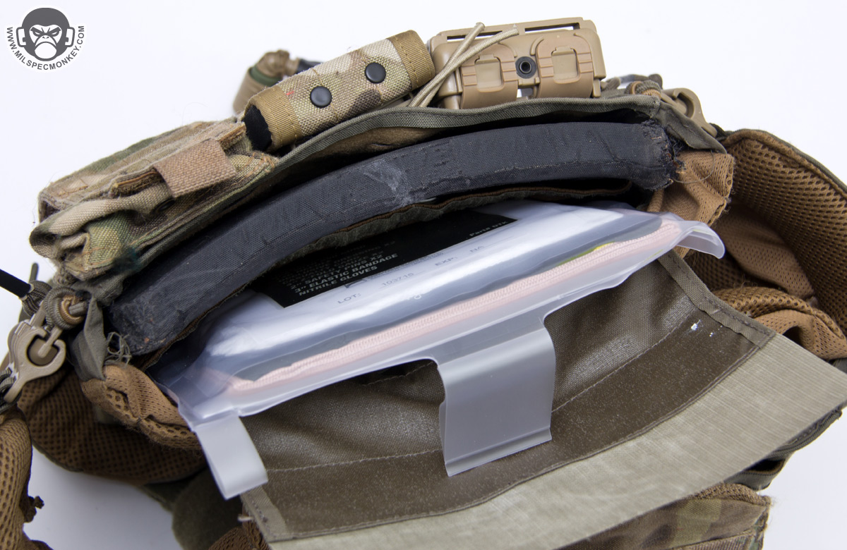 Although the Sons Trauma Kit can be placed into about any plate carrier, having one that has lower opening separate soft and hard armor external access should be a strong consideration. Usually the hard armor pocket has a pretty serious closure due to the intended carry weight while the soft armor pocket tends to have a lower key velcro closure. Due to this, one of the most preferred setups is to have the Sons kit in the soft armor pocket with the main pull tab sticking out through the opening allowing the easiest pull out access while being worn. An example of this would be seen on the First Spear AAC carrier, yet even on vests with separate soft armor pockets, having some other sort of retention is common. This can be seen easier on the Eclipse RBAV-AF which has the soft armor opening higher up rather than being at the bottom, which does make sense as the main purpose is to keep the soft armor in there even if the velcro seal gives out. For better or worse this causes enhanced retention on the Sons Trauma Kit, making it more difficult to extract one handed.