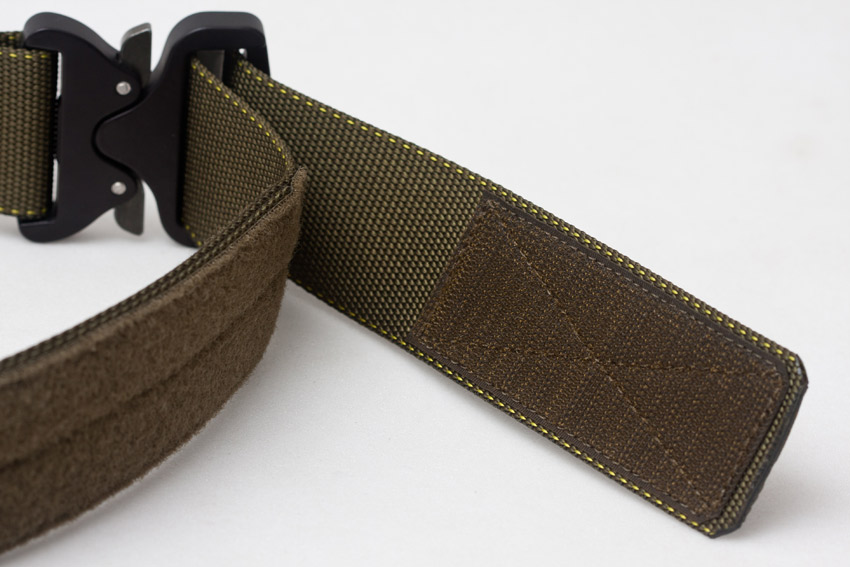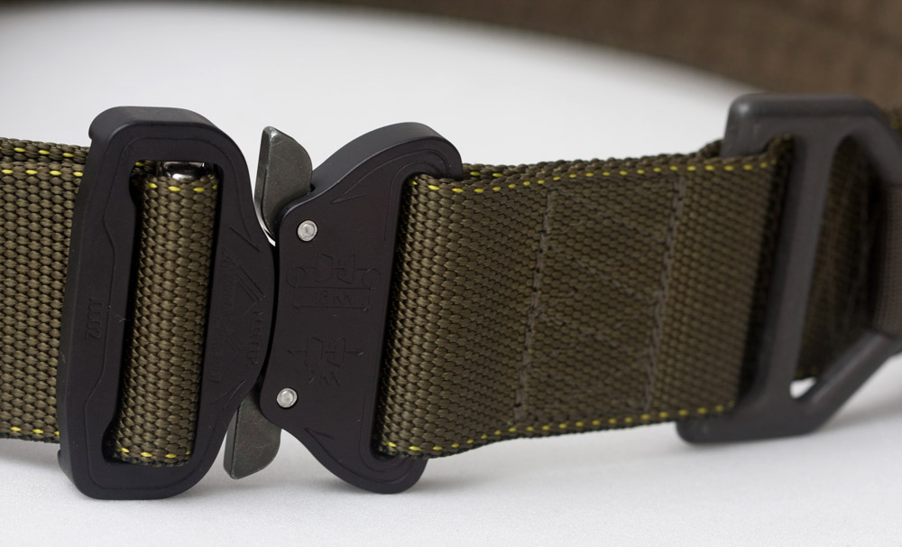 This is no small remark as airborne gear has the constant reminder any failure tends to result in death. The highlight is certainly the Cobra buckle as it meets the strength requirements of traditional hardware while being releasable. As a result you get the convenience of being able to quickly buckle or unbuckle without sacrifice to safety or performance. The addition of velcro is welcomed to secure the extra slack. Perhaps the tail could be tapered a little more, but the existing small 45 degree cuts do help with strap feeding. The large rigger's type D-ring can also be secured with a velcro strap so you don't have to worry about it flopping around when not in use. This brings up it should be noted the D-ring won't fit through many pant belt loops so keep that in mind if your pants have loops closer to the frontal middle than normal. As shown on the last pics with my Crye pants, the buckle is slightly offset, but it worked out nicely where I was able to tuck into the pant loop for storage, alternative I could secure over the loop as well. The Cobra buckle part wasn't an issue with the loops since the male part is removable. This does take a little bit more time than a common slim belt, but nothing crazy. None the less, maybe I'm a lazy bastard and commonly find myself just leaving them on the pants. This particular version incorporates stiffener which adds a good dose of heft to hold holsters and droplegs more effectively without getting all sad and droopy. The result is a nice balance between non stiffened belts and super stiff duty belts. So far it is holding up great and no complaints; without the company label I would have guessed it was made in America. Keep in mind the belt isn't intended to be used for a main rappelling harness, yet still will nicely do the trick when needed as an emergency backup. STRATAGEM also offers other belt variants including ones without stiffener for comfort and non Cobra versions to save on cost, be sure to check those out as well.