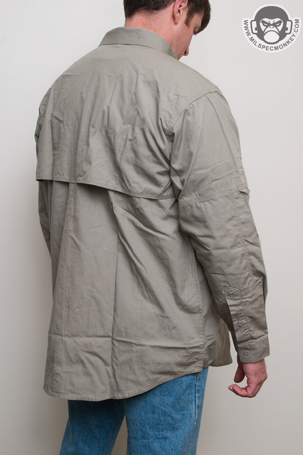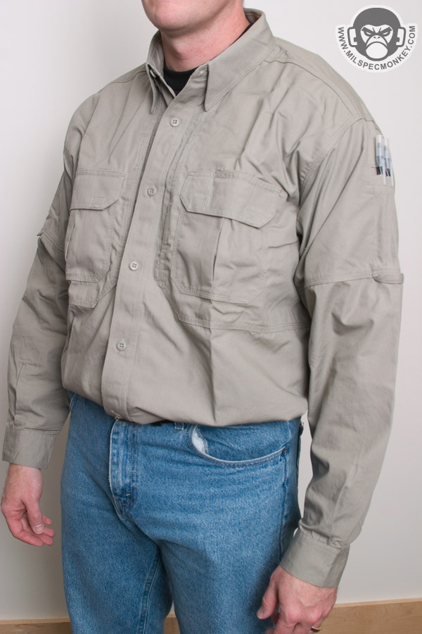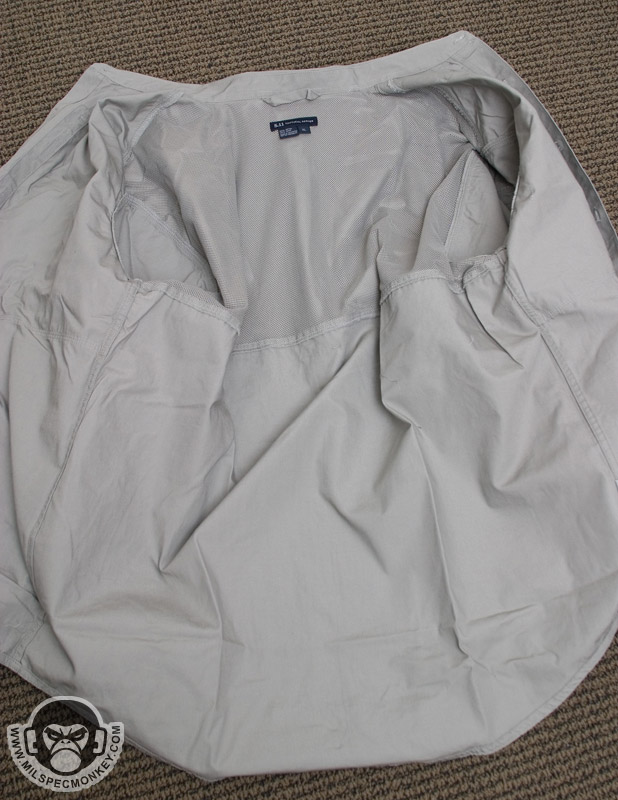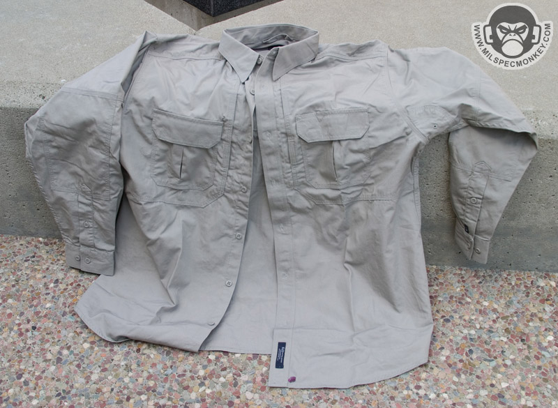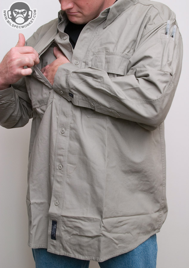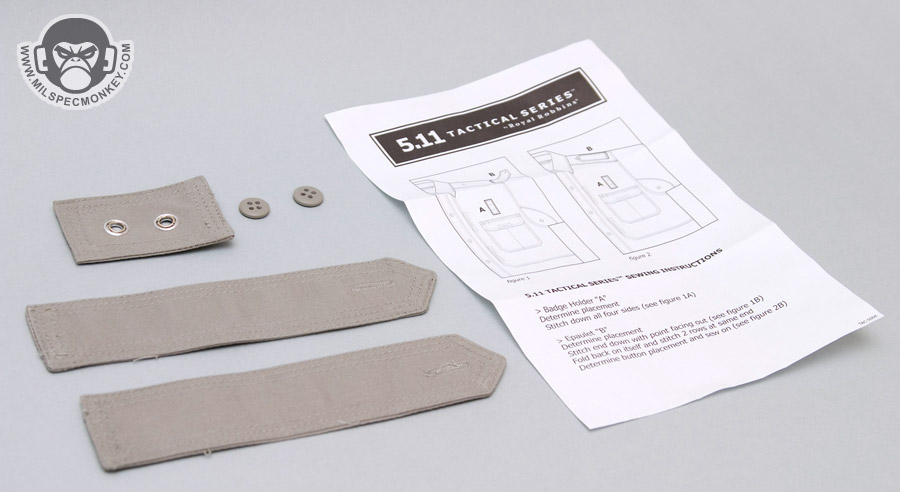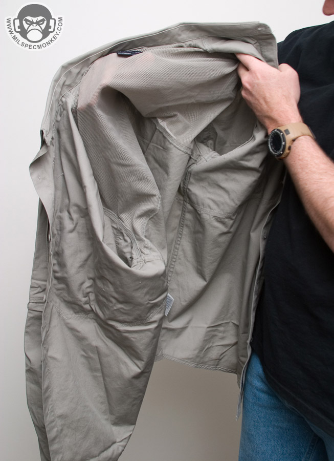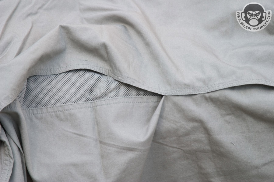 In the rear is a ventillation opening to keep things cool, however mesh is used to keep bad elements out. 5.11 went the extra mile and most of the shirt is tripple stiched. Also included is a badge holder piece and Epaulet shoulder pieces with buttons. Sewing is required for adding these items. Sorry for the out-of-bag appearance on these pictures. I had to quickly take pictures when I met up with my SF friend who will be further using and reviewing the shirt.