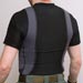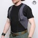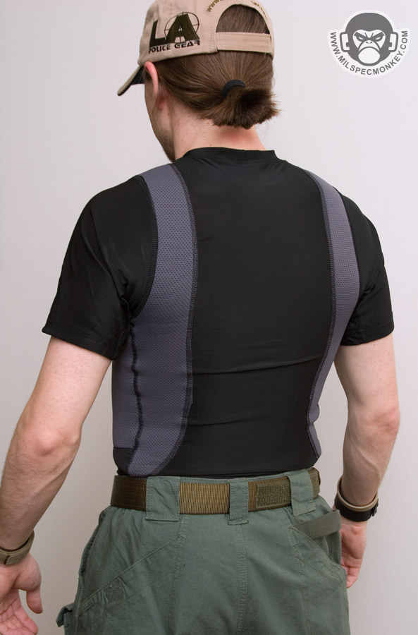 It is not meant to be a speed draw system, but if you want to get to your weapon as quickly as possible, you will need to make sure and have buttons open on any outer layer clothing. When going super low profile the outter layer of clothing is important since the holster shirt gives a less than casual wet suit / compression shirt look. If not covered, people will be able to see the shine of the shirt and think you are going clubbing soon, or up to something when you'd rather be blending in. The length of the shirt is nice and long so you won't have any trouble tucking it into any pants and still have the option to pull it up some to make the fit more loose. From wearing around, I noticed a slight draw back is that the shirt gets a little itchy on the lower sides where a good deal of stitching occurs. Back to plusses, the shirt can be used for any other items you can fit in the pockets: phones, mp3 players, handcuffs, and more. The 80% polyester/20% spandex fabric sports moisture-wicking, antibacterial and quick-drying qualities. Currently this shirt is available in white or black and also in V-neck.