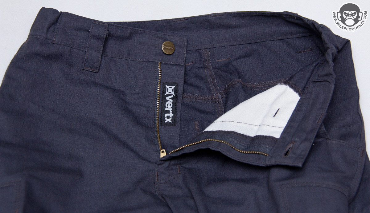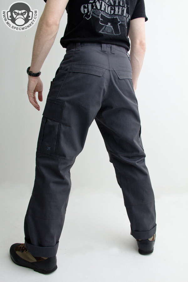 The Cargo pockets have larger flaps, I'll guess for improved item retention when filled, and a more traditional 2 billow folds style to offer more expansion. The back pockets also changed a little with the addition of flaps. These are done in a similar style to the other flapped pockets, but I feel have too small of an opening as I really have to ram my hand in there to get into the pocket thus putting a wallet back there may make for a complicated retrieval. I'm considering removing the bar-tacks closer to my ass crack on these pockets to lose a little item security yet making the opening a lot wider and easier. Since not as worried about looks on this design Vertx snuck their logo on the left cargo pocket for added sass.