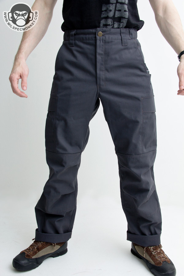 Other standard features include a gusseted crotch, articulated knees, good sized belt loops, elastic stretch zones on the sides of the waist, bar-tacked stress points, and a durable metal zipper with metal button. As for fit, for starters I was happy to get them in my true size of 28-30, where most pants only go down to 30" waist. The result is a nice fitted look while not robbing the user of mobility like a pair of skinny jeans. They do come pretty long however assuming the buyer will get them hemmed so I gave that a shot as my first hem job and think they turned out good enough. I didn't have grey thread laying around so just used my heavy duty OD-green thread if anyone was curious why the hem line contrasts a little. On the note of color, this smoke grey is a new offering that seems popular with the urban cool kids these days and is not offered on the original pant.