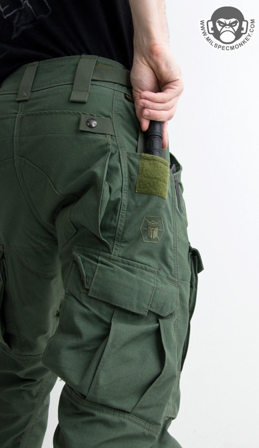 The back butt pockets are roomy to begin with and sport a similar snap system as the cargo pockets. This allows them to billow out even further to offer some very diverse holding options, enough to even be considered a dump pouch. The snaps work well so the pockets don't bust open on their own, as opposed to another connection method like velcro. No flaps are on these back pockets either for ease of use yet as a balance to security, the belt loops above these back pockets have extra loops for lanyard connection points. A little further down are calf pockets which perhaps get less use, but are still handy for lighter weight stash zones.