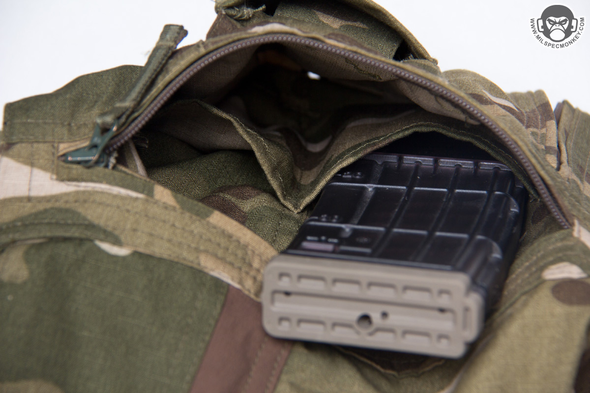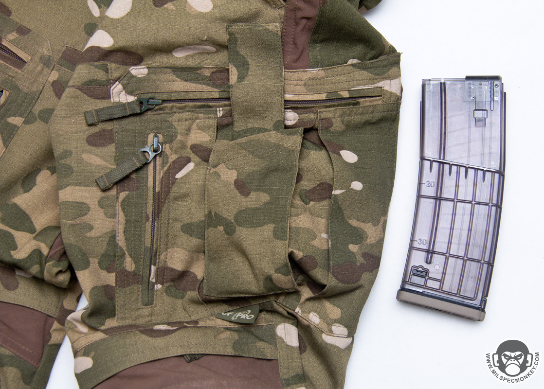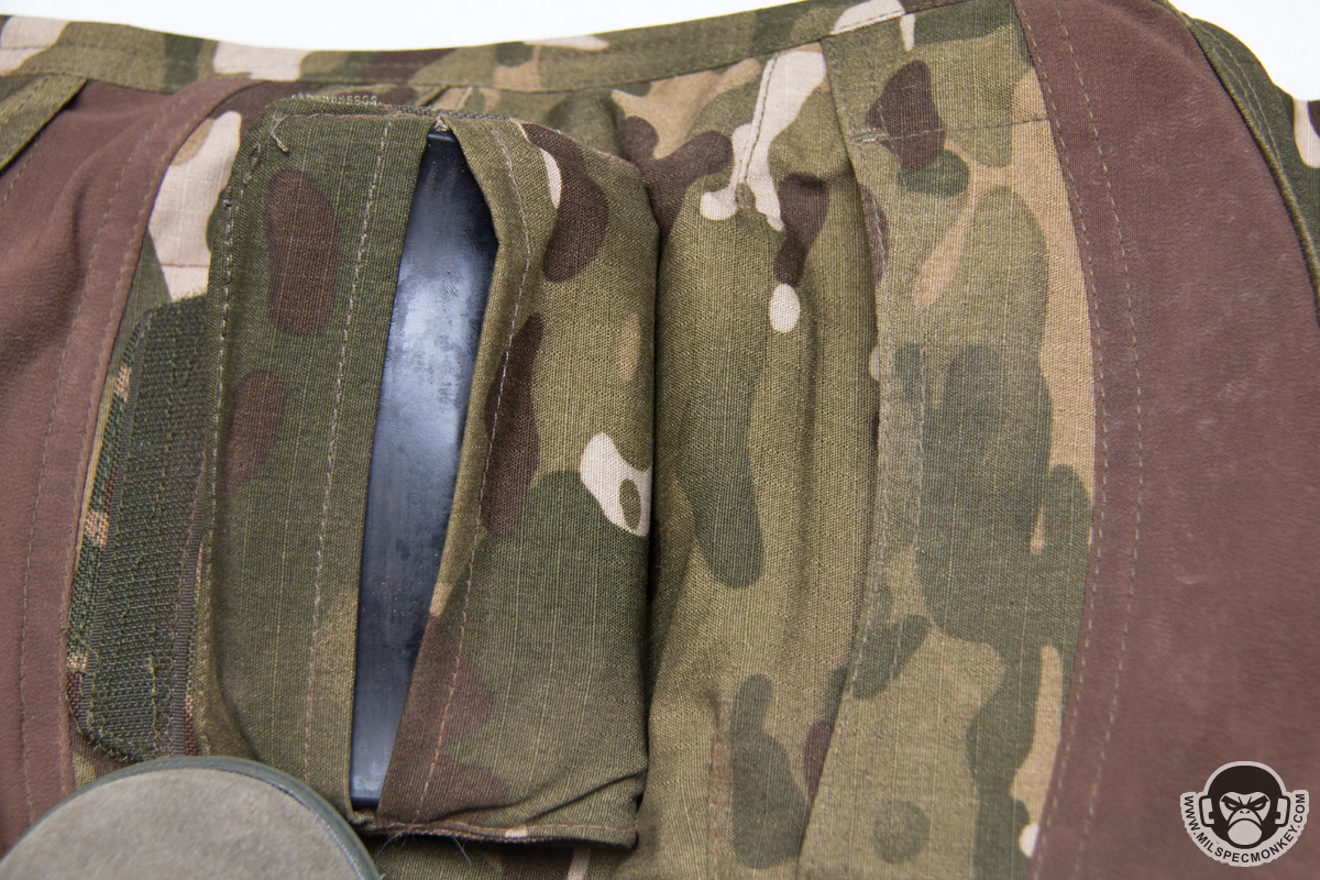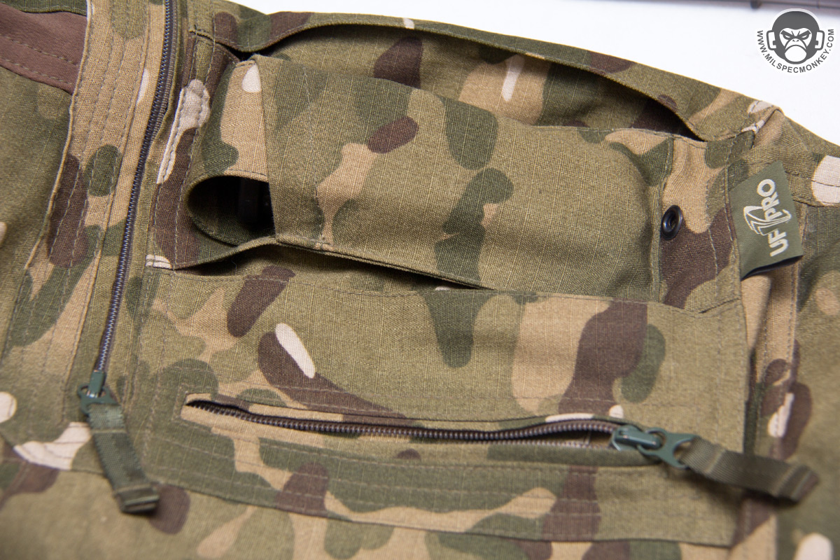Getting into pockets the main side hand pockets are pretty typical in size and depth. The interior fronts have a nice soft material to be gentle to your hands or electronics. On the right side pocket there is an additional covert zippered pocket, so sneaky I missed it during the photo session. This can be useful for both concealing and retention of sensitive items. Moving down a little over on the front are some smaller pockets good for folding knives or pens. Typically I'd like larger pockets here, but the way the cargo pockets are sized and placed there isn't much frontal thigh pocket placement room. What would be called the cargo pockets are done a bit different than usual. Not quite as tall since they don't have flap openings, but pretty wide they have zipper access on top and towards inseam sides. The zipper access gets around issues found with velcro such as noise and long term retention, however the openings are certainly more slim as a result. These cargo pockets are fairly optimized to hold one rifle magazine type item, but between the inner sleeve pockets and the slim opening I found it difficult to stow notebook like items quickly. I can't quite get the quick dump pouch use out of the cargo pockets that I'm used to, as a trade however, I do get enhanced item retention. Despite keeping generally flat in appearance on their own, if you can get passed the opening issue, there is plenty of built in billowing to stuff a decent amount of goods into the pockets. There is even a bonus external pocket on the cargo pockets, about pistol mag sized. A flap with a little bit of stiffener is used to offer a little bit of retention. I see this as a no noise priority design, however wish the flap was longer to give more item holding options and further increase item retention. As is, it helps hold the item in better than nothing, but not obstacle course ready. During class I made decent use of it as a flashlight pocket, yet as expected it did fall out a couple times.
