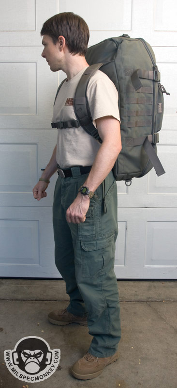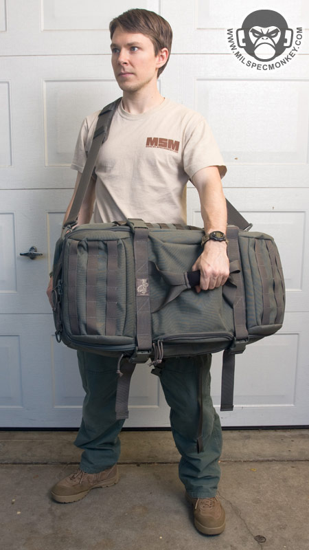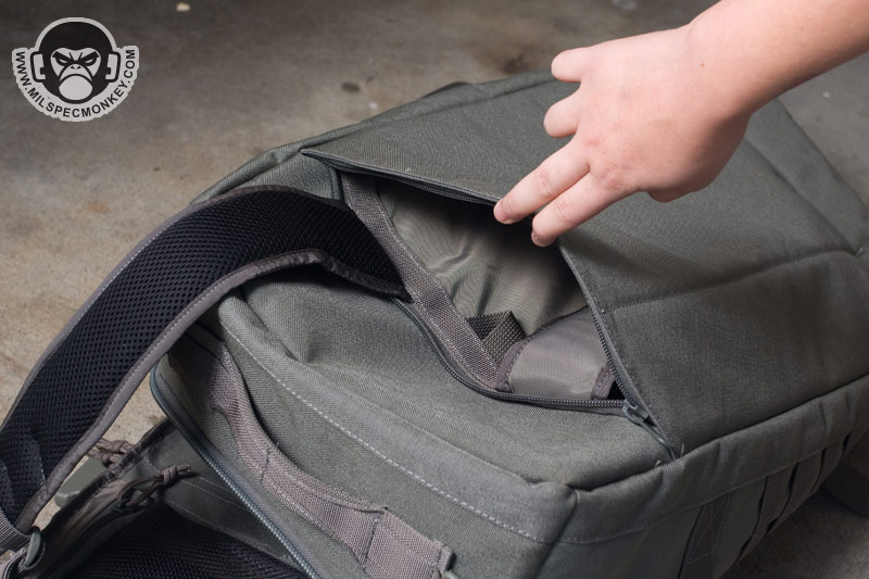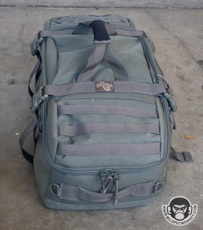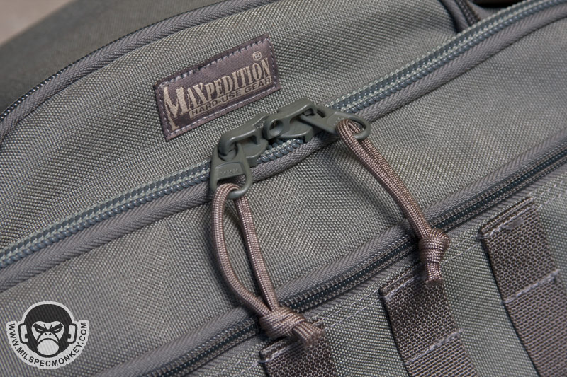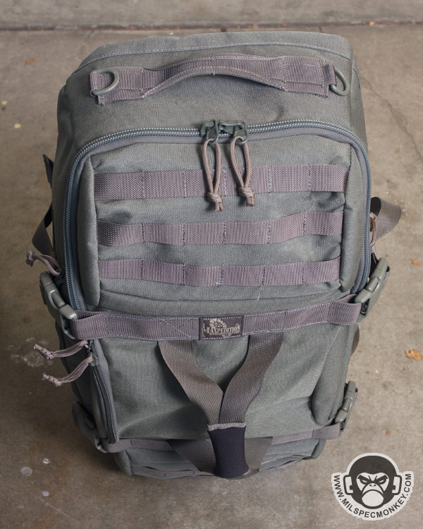 The general shape is lugage based, but some subtle curves have been added which let the pack open and close easy also delivering a comfy ride in shoulder or backpack mode. On that note, there are 3 main modes of carry: Main handle in the middle, Optional shoulder strap, or Integrated Backpack straps. The middle handle is nice and beefy with foam around it for comfort. This won't be the most used method, but is good for quick pick up and go action. I like how it is just in the middle and doesn't prevent access to the bag. The included shoulder strap is based on what Maxpedition usually gives which is pretty good. 2" webbing with plastic snap hooks and a pad that attaches with velcro straps. There are D-rings on each corner of the pack for a total of 4 to allow you to get creative with shoulder strap connection. I like to do it as shown in my first picture since this way my body mostly comes in contact with the bottom. It has a good amount of foam padding down there to aid in comfort with a dash of item protection. My fave is the backpack straps which allow the best mode of carry for long distances. The straps are connected to the bottom of the pack which then connect to lower D-rings with snap hooks. Even a sternum strap is included. When the straps aren't needed the user just unhooks the snaps and then can tuck the straps into its own zippered pocket. This makes the bottom nice and clean, great for air travel where a bunch of straps can result in a shredded bag.