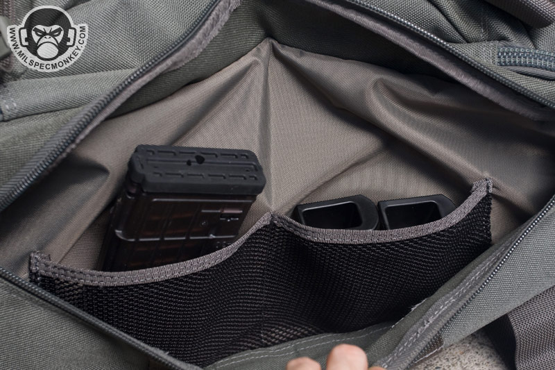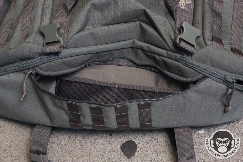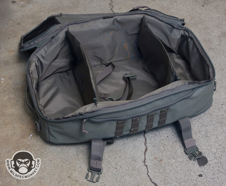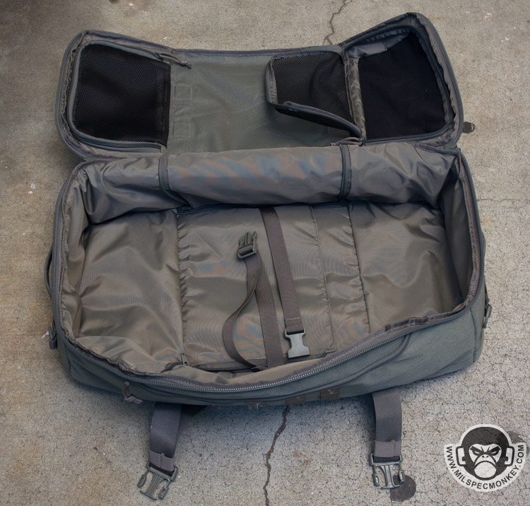 The main show is definitely the main compartment, but all the sneaky organizer pockets are quite handy as well. Starting in the top middle is a double zipper external pocket. Good for quick access items or when you have fully stuffed all of the other pockets. On the sides are long slim pockets with single zipper access. Inside are mesh sleeve pockets for further organization. Although slim pockets, one can fit a lot of tool items or weapon magazines in there. It is also a great place to put the shoulder strap when not needed. On the inside the main lid has 2 mesh zipper pockets integrated which are good for toiletries or electronics. For even further separation there are built in dividers in the main compartment. These can be zipped up when needed or zipped down and folded over when not. In the middle is a strap that connects with an SRB for lash-down options. For an extra detail the main compartment zippers are even lockable to keep those out who may have taken some "shipping tax". These zippers can get a little loud during heavy movement, yet can easily be fixed by cutting off the metal pull tabs and just reattaching the pull cords.