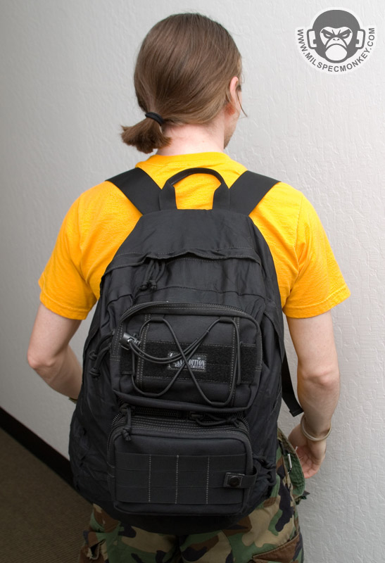 When all packed up the "front" has loop velcro for ID patches, a shockcord rig, and a sleeve loop for belt mounting. Double zippers open up a pouch with elastic loops inside. Moving to the opposite side is a similar sized pouch, but with PALS compatible webbing for using malice clips. Dual zippers open up clamshell style and the inside has interesting divider panel that makes the pouch separated for left and right access. The snap can be used as zipper divider for this setup or a zipper lock. Once the middle is expanded, both of the end pouches are easily accessible on the outside of the backpack. Athough the exterior is made of 1000d ballistic nylon, the backpack material is 420d so it can be packed up. The backpack has an extra hydration pocket with velcro opening and D-ring which can hold up to a 100oz bladder. Currently available in Black, Green, Khaki, and ACU.