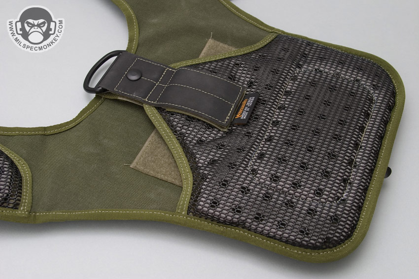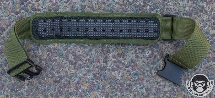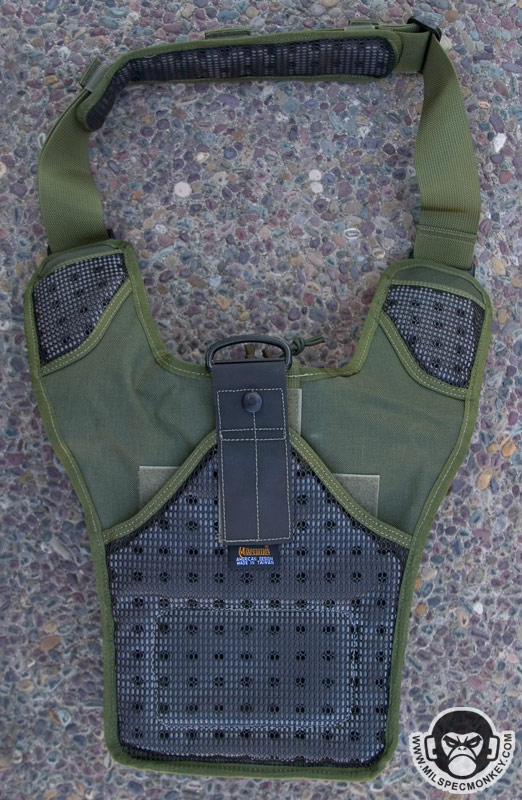 The adjustable shoulder strap has one female and one male side and comes with a removable shoulder pad. The pad is similar to the old style with velcro flaps, but the bottom now uses the foam with rubberized nylon grid. The connection points back on the actual pouch have elastic loops which are great for having over the SRBs to help prevent accidental opening. If one does not need this and wants easier operation, they simply push SRB out under the elastic and let it rest on top.