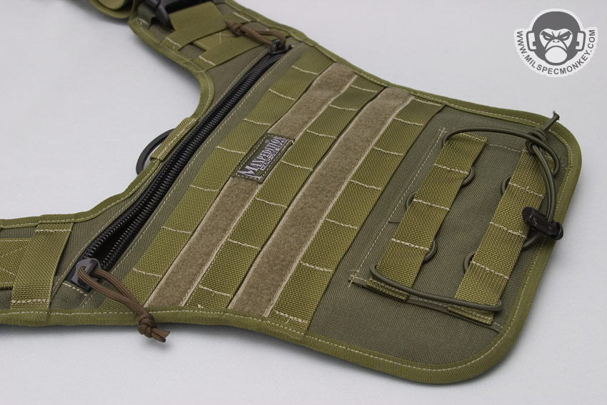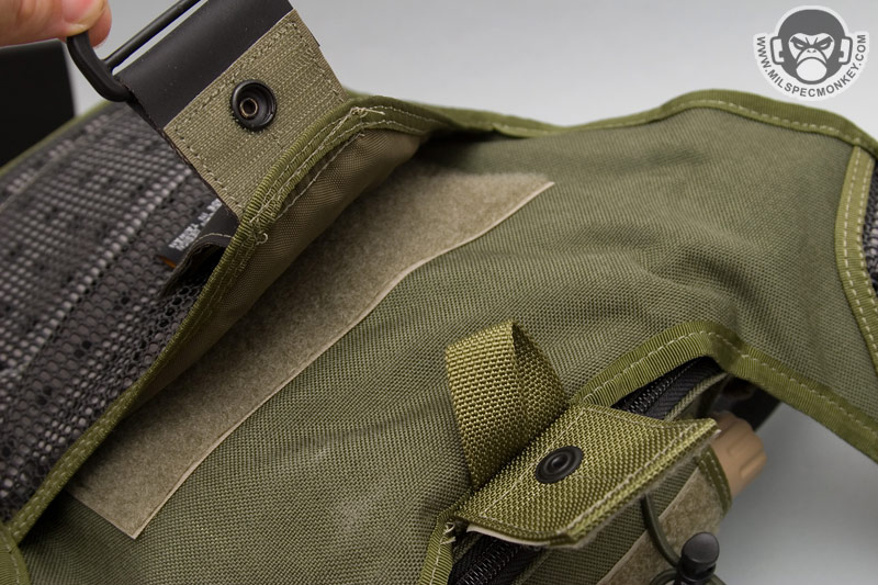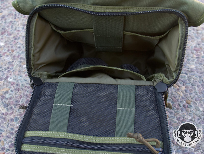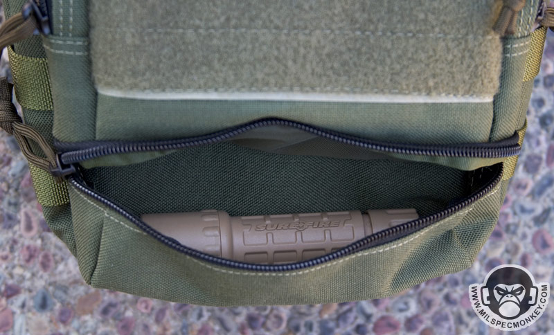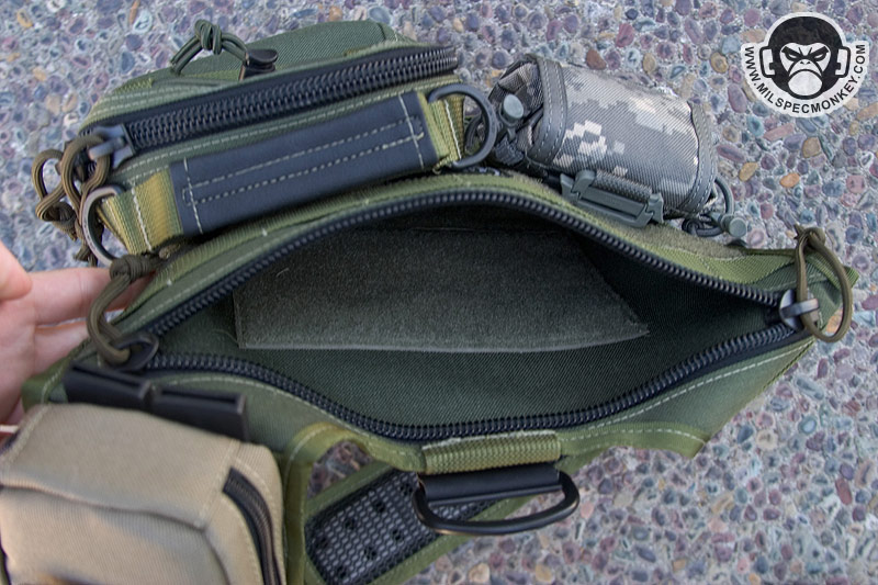 Moving a little further down is what I call the mid pocket. This area is a good square size and has 2 sleeves in the back each with elastic velcro flaps. Behind these is another divider sleeve. At the bottom is a velcro seal to allow one to close off or create access to the lower pocket. On the exterior of the mid pocket is a loop velcro panel and a slim single zipper pocket. Maxpedition has been listening to my suggestions and put the logo out of the loop so the pride can still be there, but not at the cost of your velcro space. Blending in at the bottom is the lower pocket which has a single zipper opening and can fit a beefy, but not super long flashlight.