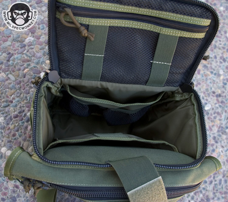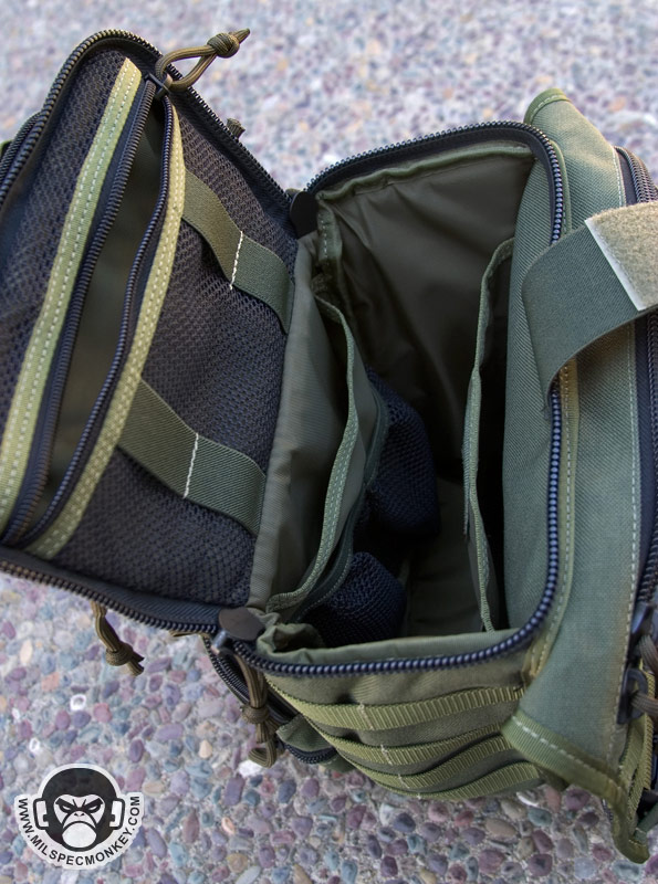 The main CCW area hasn't changed much which is not a bad thing. A big plus is the double zipper opening to make things more ambidextrous. Like before on the Jumbo, this pocket has a big 7" x 8" loop field great for holding the maxpedition modular holster or mag / multitool holders. When going all out CCW, I suggest deciding on your most comfortable zipper opening direction and then making a big pull cord for that zipper. Then make sure to move all the other pull tabs away from the pull cord so they are not in the way. On the Manta when CCW is in mind, I do not use the top PALS row to give myself good room to grab the zipper pull. Back to both, a slight problem occurs when mounting extra pouches to the webbing on the upper area where the straps connect. Pouches that "fit" here usually start to dig into your zipper area. This isn't a show stopper, but does cause one to have less of an opening since the zipper will ram into the pouch or its Malice clip.