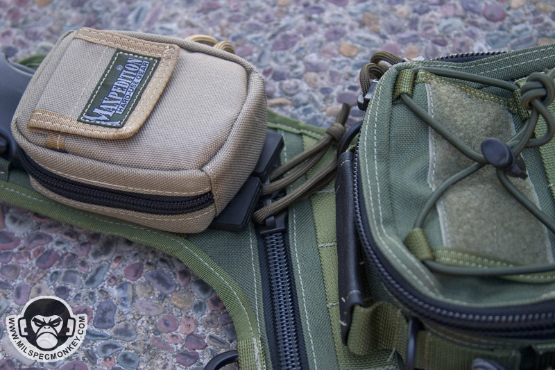 While the Colossus went in the size increase direction for the Versipack line, the Manta went the opposite way. The Manta on its own is not much more than beefy shoulder strapped CCW pocket, but has huge customization possibilities when other pouches are added. Due to all the PALS webbing on the front of the Manta, this makes a great platform to form the Versipack you always wanted or just need on specific day. One simply attaches other PALS compatible pouches as desired. The upper area is 3 Rows x 6 Channels (not counting 2 extra loops up top) and the lower area is 2 Rows x 4 Channels. The upper area has loop velcro between the PALS rows for ID patches. I'm not a fan of the Maxpedition logo being in the middle of the upper velcro strip, but one can destich it off without too much hassle. The lower area comes with a shock cord and cord lock rig and is ontop of a sleeve which is good for flashlight like items. I personally would have gone with 2 Rows x 6 Channels for the lower area. The sleeve area would be lost or harder to use, but this would allow a lot more mounting options. When creating loadouts for the Manta I find myself adding pouches where I want to, but they are less secure since the PALS webbing I spoke of is not there.