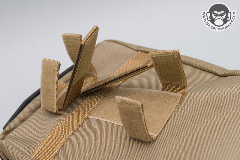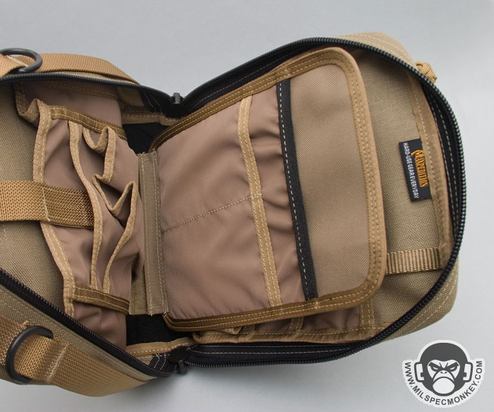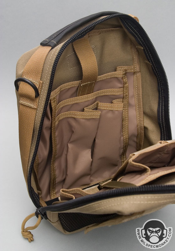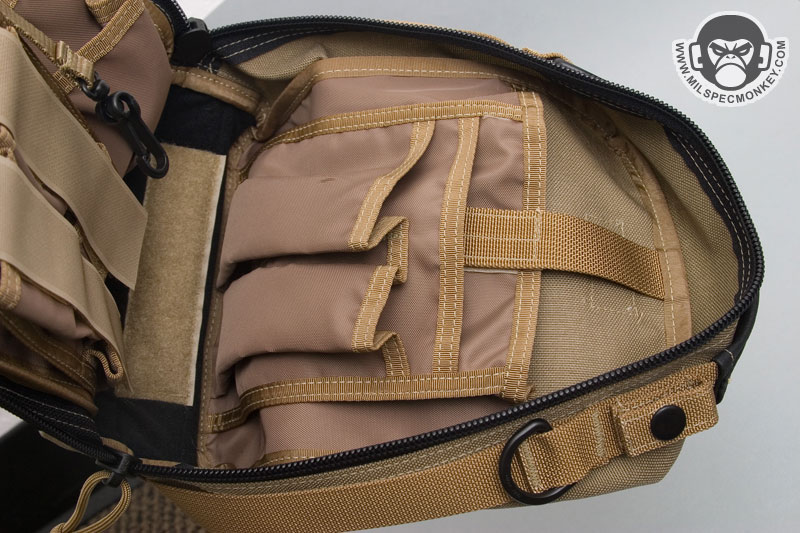 Core features on the exterior include a non-slip covered handle on top and long webbing strips on the side which can also be used as side carry handles. The frontal upper right has a snap to secure the pull ties of the zippers to the main pouch. D-rings on both upper sides are the main connection points for the shoulder strap, but can also be used as alternate connection points when mounting to other gear. The shoulder strap is done in the style common to versipack line that is 1.5", uses plastic snap hooks and includes an adjustable / removable shoulder pad. The back has a pretty fancy setup to connect to belts or PALS webbing. Integrated with a large sleeve pocket are 2 long vertical webbing strips and 2 horizontal strips all with velcro to create secure loops. The upper part of this area has a sewn small webbing loop to be another tie down point. The pictures likely describe this a lot better than my words.