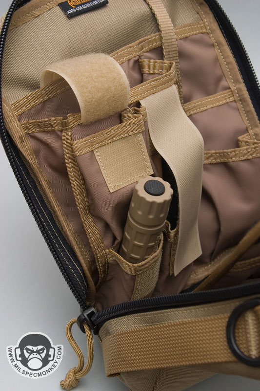 After opening up the main double zippers we get to the pocket fiesta of the inside. The Neatfreak zippers go down pretty far, but not enough to call it clamshell style. The back interior consists of: a large expandable depth sleeve pocket with velcro webbing strap, a medium sized thin sleeve, and 2 tall pockets about flashlight sized. The main large back sleeve with the strap can hold a lot more than it looks.The interior back side has a similar, yet still unique layout of: a plastic lanyard clip on thin webbing, large back sleeve, medium sleeve with a little expansion, 2 tall flashlight sized pockets with velcro flaps which also have half tall pockets attached to the bottom area of each, and an extra shorter pocket with some expansion on the side. The velcro flaps can be used to cover both the tall and short flashlight sized pockets, or just the tall ones. The flaps are kinda meh, since they are just raw velcro. I would have liked them more as webbing with velcro sewn on. As is, they will still secure objects inside. In the middle of the inside is the cool modular and removable divider velcro panel. One side is all loop velcro for modular attachments / pouches while the other side is 1 medium sleeve and 2 half-size sleeves good for small papers or pens. Depending how one uses the panel, they can go for more EDC carrying capacity or spice it up with a modular holster for some CCW action.