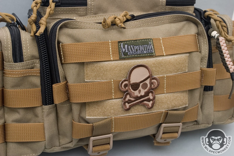 Let’s go ahead and break down all the pockets and what-not. At the very top is the Maxpedition style sleeve with shock cord and cord-lock rig. Loop velcro is down the middle for patches. The sleeve and cord allow you to ram items in there for low security, yet easy to access capability. If this area is a little more than you need, feel free to take off the cord rig to streamline things up a bit. This top area has its own pocket with double zipper clam-shell opening that folds away from the user. Inside is a sleeve with 1" horizontal elastic loops on one side and a zippered mesh pocket on the other. This is a great place for the smaller goodies.