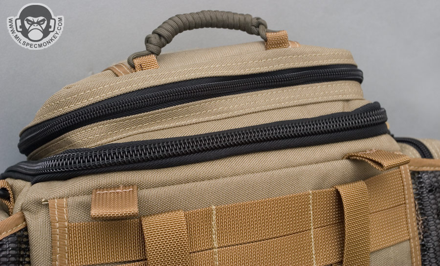 -Added 550 cord handle up top, only meant to be a quick grab. If I want a full on handle I will connect a shoulder strap to the top D-rings.
