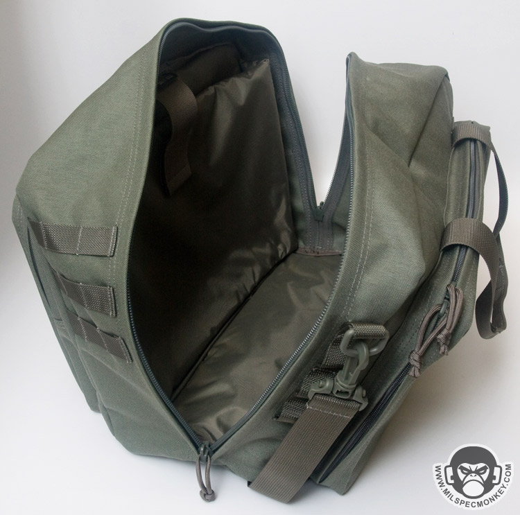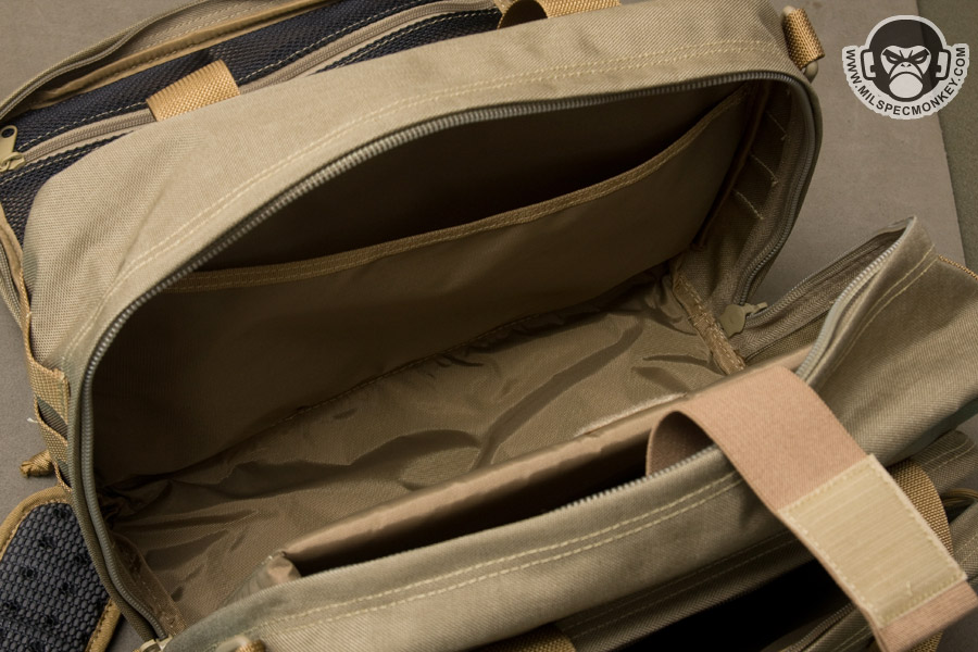 The main compartment opens up with dual zippers that go all the way down to the bottom, but not quite clamshell style. This allows for a nice wide opening and as a bonus the zippers are even lockable. The main compartment inside is pretty straightforward, however does include a sleeve pocket on one side and a padded side compartment for goods such as laptops. An elastic and velcro strap is included for retention on the laptop compartment. Rather than right down the middle of the main compartment, the zipper is on an angle. Using the offset space on the sides, there is a D-ring for the shoulder strap on the thinner side and 3 rows x 2 channels of PALS webbing on the wider side. On the other sides are secondary pockets with dual zipper openings. One has loop velcro on the exterior and only unzips halfway down the sides. The interior has a simple mesh sleeve pocket divided into 2 parts. The other side has a full clamshell opening and has a mesh sleeve pocket as well, but also has a key lanyard and a large single zippered mesh pocket. For ease of grab-and-go, 2 beefy webbing handles are up top which appear to wrap around the main compartment.