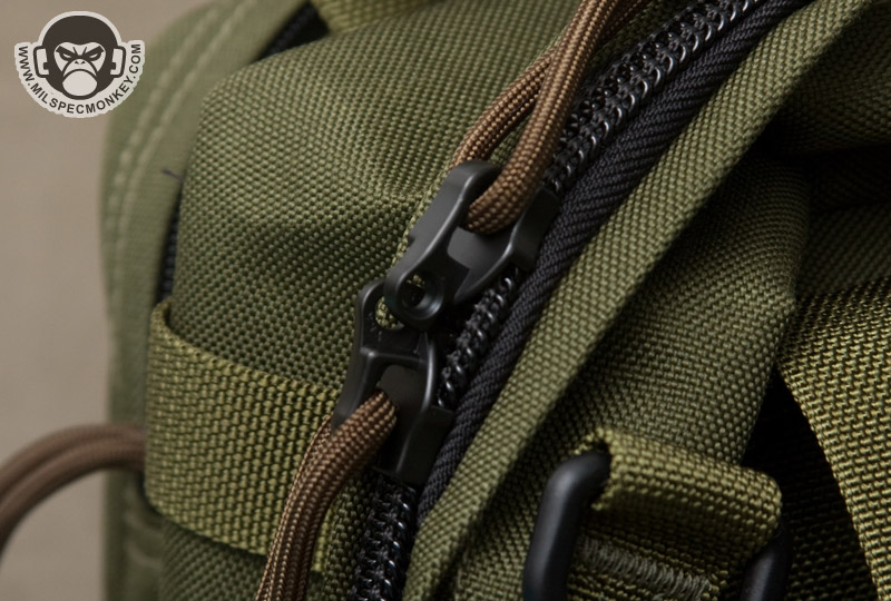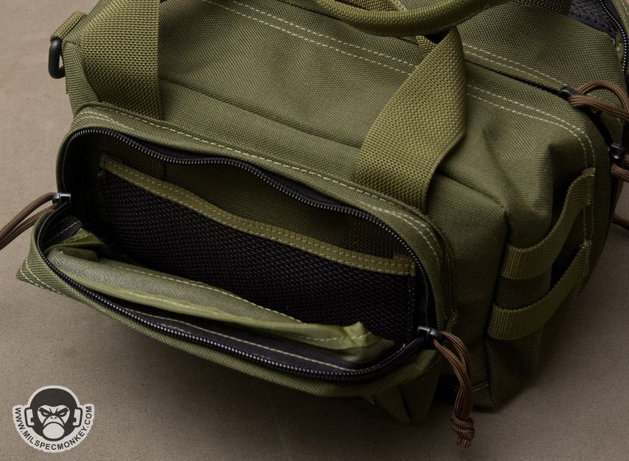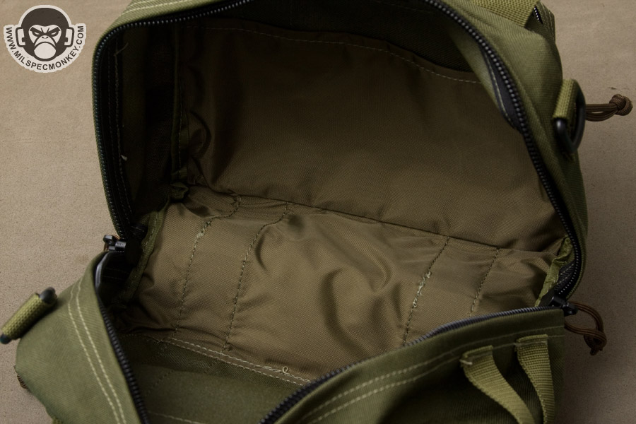 The main compartment opens up with dual zippers that go all the way down to the bottom, but not quite clamshell style. This allows for a nice wide opening and as a bonus the zippers are even lockable. The main compartment inside is pretty simplistic, however does include padding on the bottom and a sleeve pocket on one side. Rather than right down the middle of the compartment, the zipper is on an angle. Using the offset space on the sides, there is a D-ring for the shoulder strap on the thinner side and 2 rows of PALS webbing on the wider side. There is no stitching in the middle of the PALS so they are loose perhaps in favor of mounting size fudging. On the sides are secondary pockets with dual zipper openings. One has loop velcro on the exterior and only unzips halfway down the sides. The interior has a simple mesh sleeve pocket. The other side has a full clamshell opening and has a mesh sleeve pocket as well, but also has a key lanyard and a single zippered mesh pocket. For ease of grab-and-go, 2 beefy webbing handles are up top which appear to wrap around the main compartment.