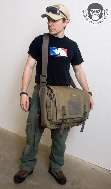 The main bag material is the 1000 D Maxpedition is known to use which although isn't waterproof, it is pretty darn water resistant. I think some of the classic biker messenger bags get carried away with their waterproofing acting like people haul loads of open tissues in hurricanes. Even then the sides of the flap usually are possible leak areas. Anyway my point is these bags offer solid water resistance, but if you really are worried about water, go get a real water proof bag over at Watershed. 2" webbing is used for the shoulder strap and as a nice touch one continuous piece is used which sewn to the bottom of the bag. This adds both bag holding durability and shoulder strap strength. No shoulder pad is included, perhaps since most messenger bags don't have one, but if desired one can be purchased as an affordable add-on. There is only 1 SRB so it promotes the bag being worn on the left side of the body for quick release capability. It would have been nice to have 2 SRB buckles for ambidextrous capability, but not a super big deal. The shoulder strap itself has a lot of slack to accommodate many body sizes using the tri-glide adjuster.