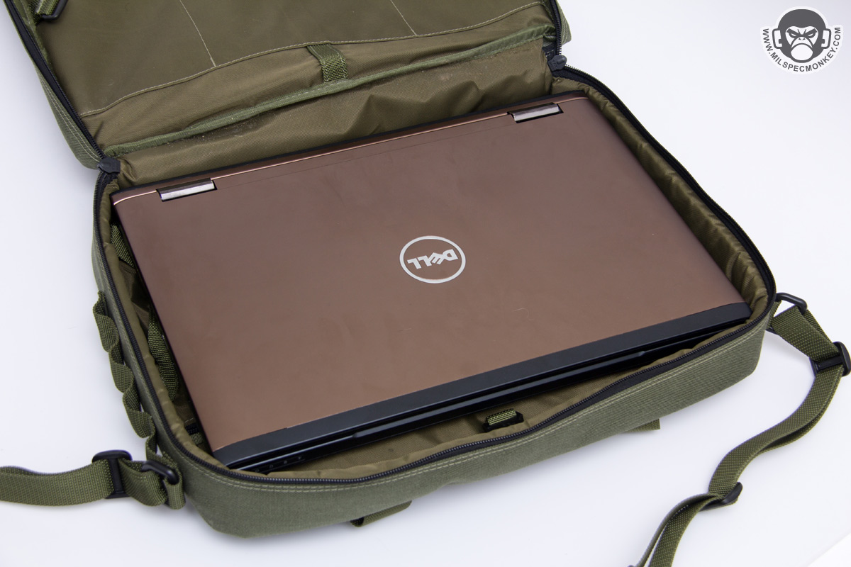 Size wise the Spatha comes in at overall approx 16.5" x 13" x 5.25" declaring able to hold 15" laptops while the Testudo is 17.5" x 13.25" x 5.5" holding 17" laptops. For an example laptop I have a Dell that is 14.75"x 10.25" x 1.25" and measures approx 18" on the exterior diagonal. Where one wants to store the laptop in the bag will adjust the capability as I could fit my sample laptop in the interior sleeves on the Testudo, which although slower to store is a more secured carry. Despite unable to do the same in the Spatha, the laptop did still fit in the main compartment interior. All interior sides of the main compartment are padded which is to be expected out of a laptop bag, however some consideration still needs to be given to arrangement of accessories and other goods on how they will compress while carrying the bag. In general I just recommend the concept of trying to avoid creating sharp pressure points of other gear "poking" into your laptop.