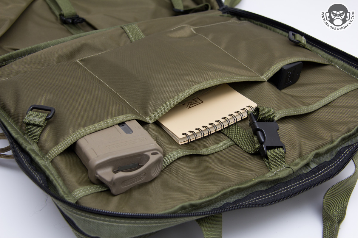 While already on the subject of the main interior I suppose we might as well follow through. As a handy feature, the double zippers open up to a full clam shell style which then can be limited with the adjustable internal webbing as desired. This is nice as most laptop bags don't offer the full opening option while the limit functionality is still there so the bag doesn't accidentally fly open spilling out your goods. The sides are well divided with a tall sleeve pocket being on one side, SRB security strap included, and 3 divided smaller sleeve pockets. The other side offers more options with a slightly shorter main sleeve pocket, SRB security strap, and 2 single zipper billowed pockets to offer more item securing options. This side handles a laptop a little bit easier with the shorter large sleeve pocket. I wish the SRBs were modular / removable as they can come in handy when something needs to be super secured, but also cause insert / extraction hassle when not needed.