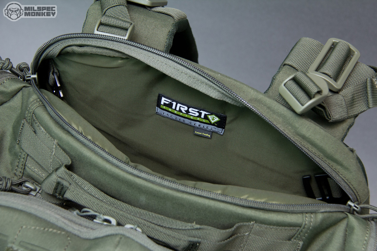 Finally on to the main compartment, the big show opens up clam shell style with double zippers. The zipper-pulls are unique and grippy, but I think the cord is a little long as it seems the other pulls work a little better or generally helps grabbing closer to the slider. These more fancy pulls are only used on the main compartment and larger frontal compartment perhaps to help ID the zones. Inside is a nice big compartment with the back being a soft yet velcro/hook compatible material. It isn't as grippy as full on loop, but you can still rock some hook backed accessories for further organization. The sides have some simple sleeve pockets, one side having a deep pocket and 2 offset pockets on the other side, good for quick stashing. The front interior has some cool mesh pouches, 2 small with single zippers and 1 long with dual zippers that attach with hook. Only a little hook is used, I believe, to allow the pouches to fill out better. Since easy to tear out they make for great medical storage, but can be useful for all kinds of things. Also not to be forgotten, since hook backed, one can attach these mesh pouches to the back of the main compartment if they like that setup better. Under the mesh pockets are some more vertical style pockets that open with single zippers. It seemed a little weird to me at first, but after inquiring with the designer they do make sense as the intended option of ambidextrous stash pockets that can be accessed with the pack front mounted. Even if not used for that, the pocket shape will give some options not seen in many other packs. Worth noting, First Tactical is starting to offer more hook backed pouches to work with these type interiors along with other cool purpose built organizers.