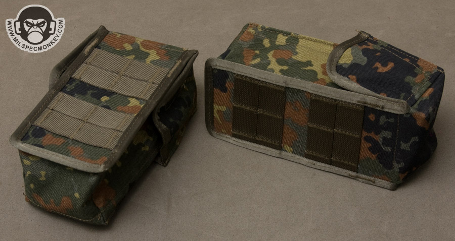 For those into simple designs this is a regulation style mag pouch for ze Germans. The connection points of two G36 mags require the need for all of the 3 inches of depth you see in this pouch. NATO mag users can take advantage of this aspect and can ram in 3 magazines easy. To keep out debris the flap is a full cover style which is nice for protection. The front and back sides of the interior have plastic stiffener to keep proper shape and add durability. To mount, the back has PALS webbing setup to interface with long MALICE clips. Making it unique to most of us SRB whores, the main security hardware is a "Spanish" style clip. It is hard to explain so be sure and view the pics. The Spanish style works quite well as a quick release only requiring one motion of pulling the webbing slack. The down side would be the Spanish style isn't as easy as other methods to resecure. No elastic is on the sides, so keep this in mind when placing 2 NATO mags inside that won't fully fill the pouch. All the materials are mil spec making this pouch feel nice and heavy duty.