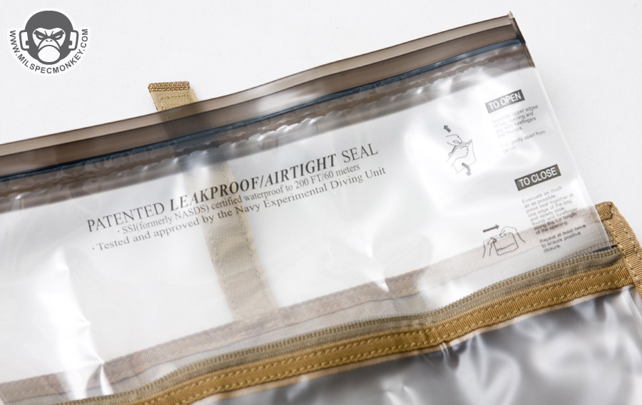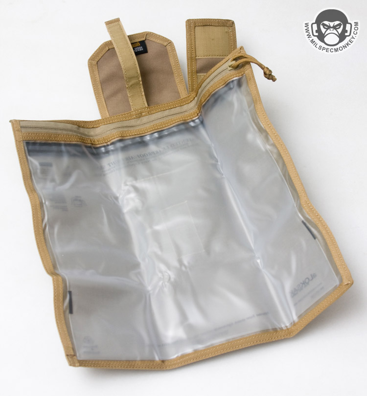 This pouch kit clearly was made with the serious navigator in mind. The main aspect is the map case which is held in by an adjustable SRB. When ready for use the map portion can be torn off the velcro and unfolded to a no joke 12" x 12" size. This allows a lot of map to be viewed at one time. A single zipper allows map access and for those who plan on getting wet on their adventures, a LOKSAK dry bag is even included.