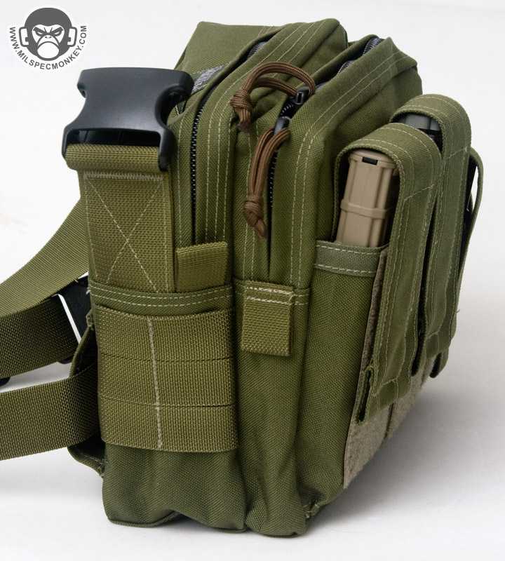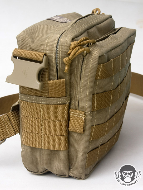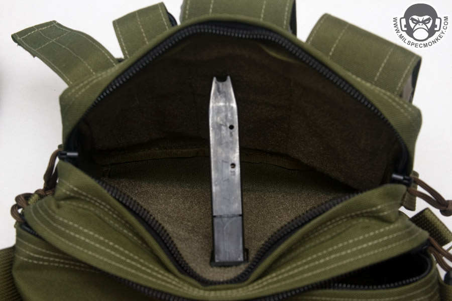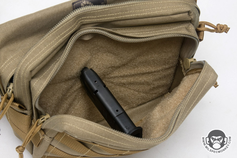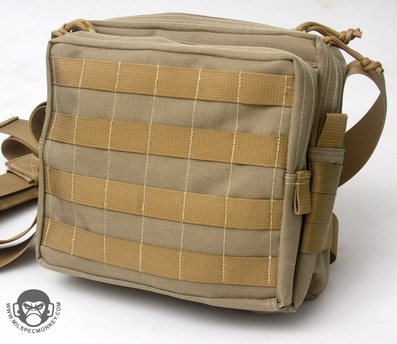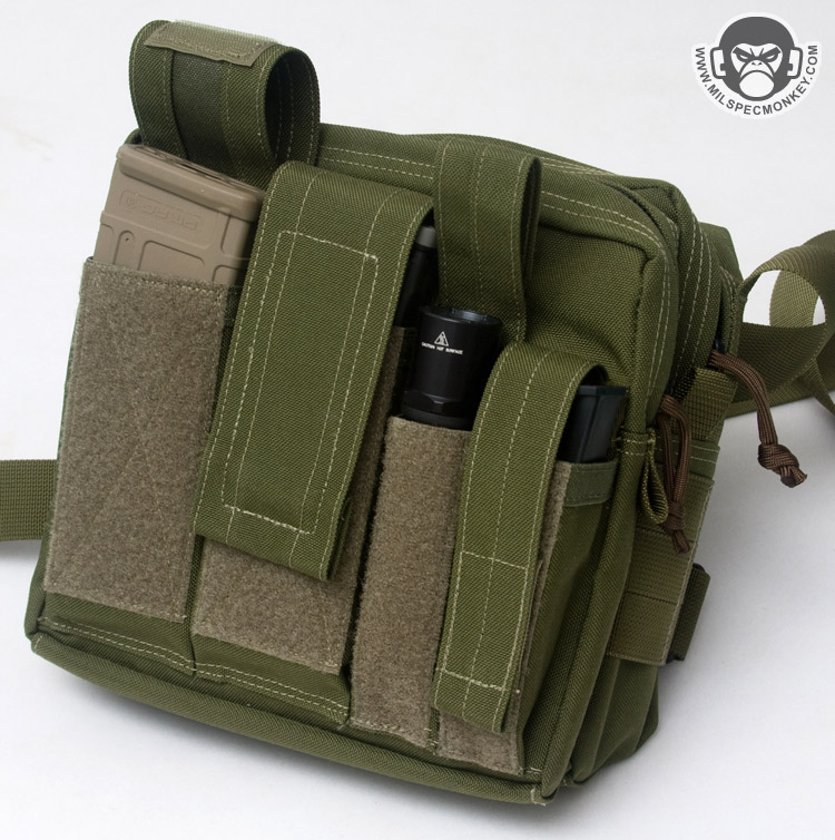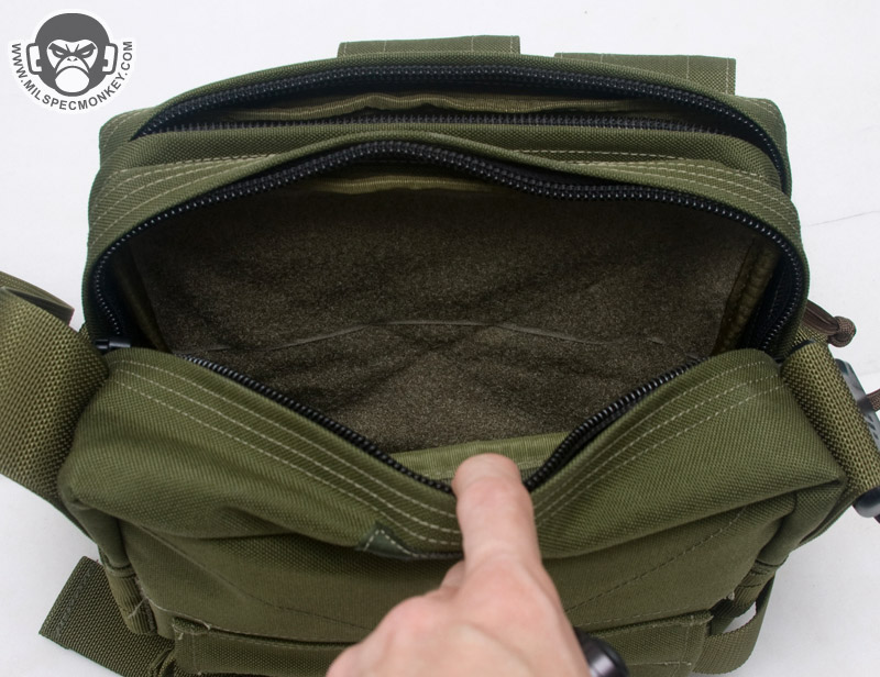Starting with the exterior there is elastic webbing on both frontal sides and on the bottom. The sides work great for chem lights and pens while the bottom can accommodate thicker items such as medical gear or folding knives. With a little elbow greese you can even get a full size CAT tourniquet in there on the bottom.