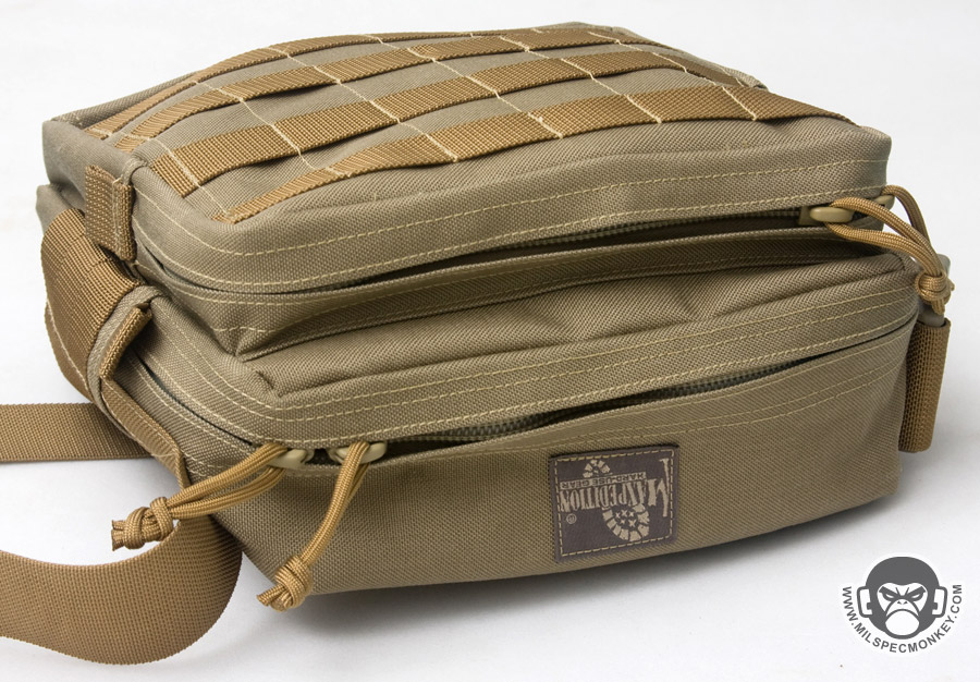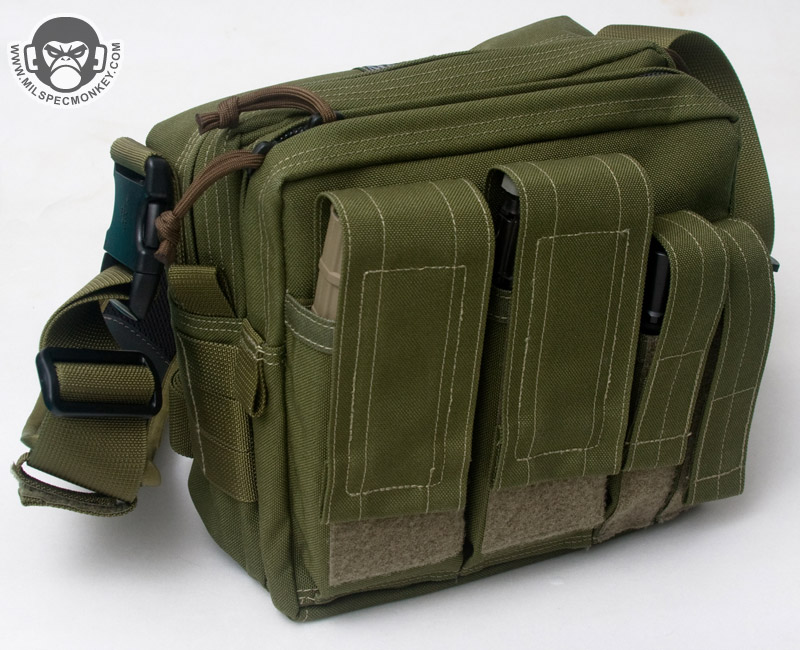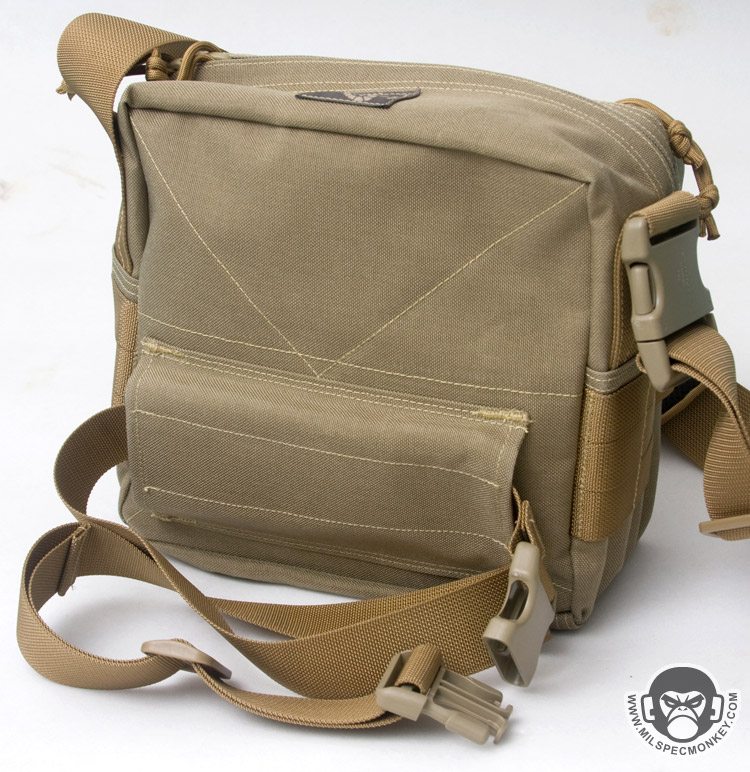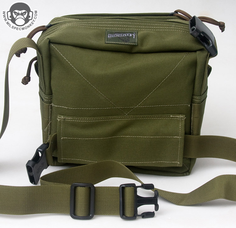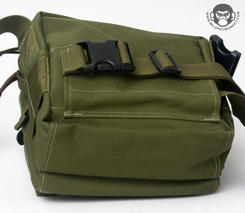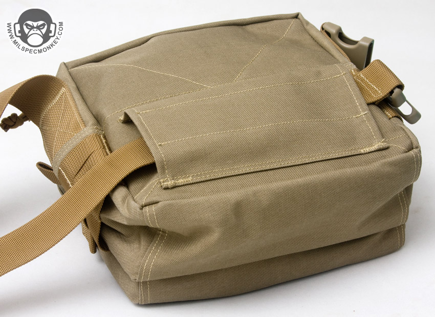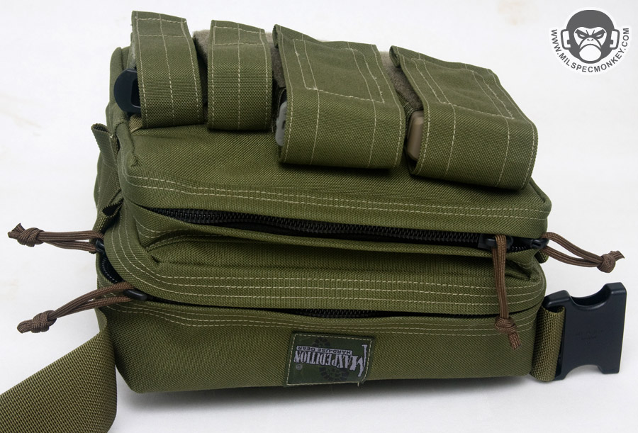 Starting with the exterior there is elastic webbing on both frontal sides and on the bottom. The sides work great for chem lights and pens while the bottom can accommodate thicker items such as medical gear or folding knives. With a little elbow greese you can even get a full size CAT tourniquet in there on the bottom.